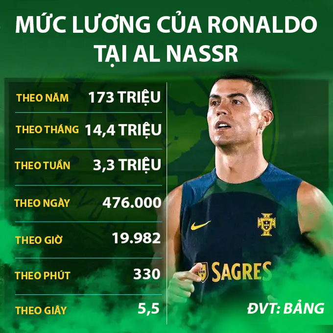 Tổng cộng tất cả các giao dịch thương mại và ưu đãi liên quan đến thỏa thuận, Ronaldo có thể kiếm được tới 173 triệu bảng (200 triệu euro) cho mỗi 12 tháng anh thi đấu cho đội bóng của Ả rập Xê út.