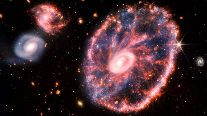 Ngày 2/8, NASA chia sẻ hình ảnh Thiên hà Cartwheel (Thiên hà Bánh xe) chụp bởi kính viễn vọng James Webb. Cách chúng ta khoảng 500 triệu năm ánh sáng, Cartwheel được xem là một trong những Thiên hà kỳ lạ, nhiều chi tiết bị bụi che khuất.