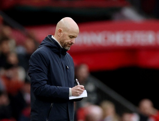 Ten Hag ghi chép trong một trận Ngoại hạng Anh trên sân nhà Old Trafford mùa này. Ảnh: Reuters