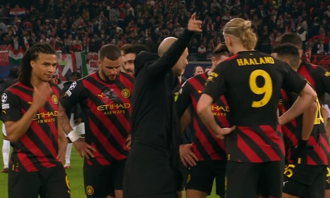 Ngay lúc mãn cuộc, HLV Pep Guardiola vào sân và mắng các cầu thủ Man City hãy ngẩng cao đầu ra về sau trận hoà chủ nhà RB Leipzig 1-1 tối 22/2.