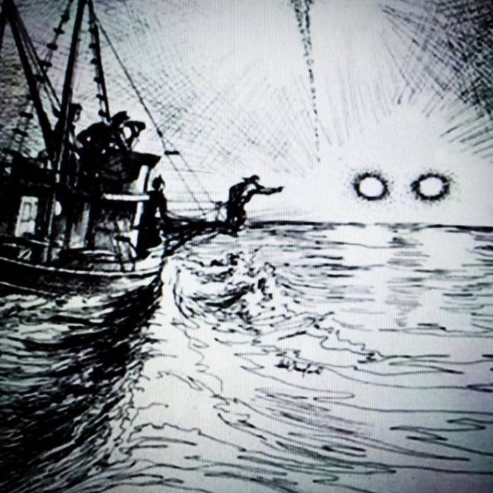 Nó đứng yên ở đó mãi đến buổi tối. Các ngư dân đang rất lo lắng, không muốn xem xét kỹ hơn cảnh tượng và dùng tay che mặt họ lại. Trong những ngày sau đó, họ bị ốm đến run rẩy toàn thân, đau đầu và chân.