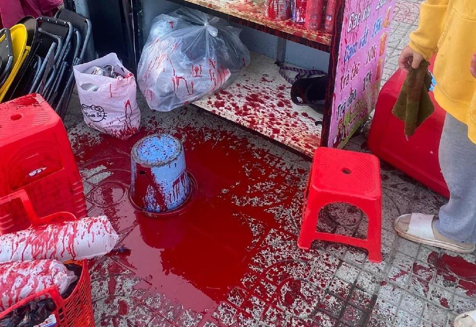 Hiện trường vụ tạt sơn khiến tủ hàng, đồ uống và vỉa hè nhuộm đỏ. Ảnh: D.D.