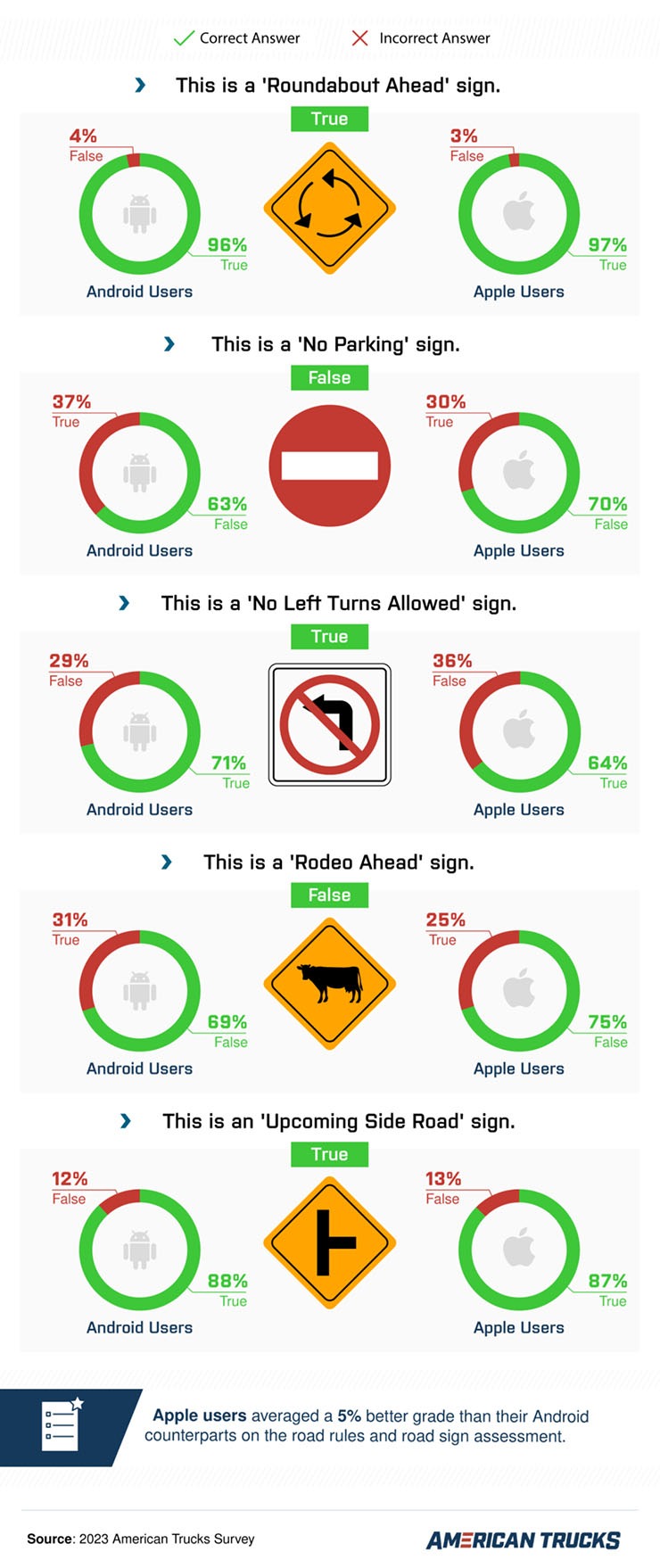 Kết quả của cuộc khảo sát đã vạch rõ ranh giới giữa người dùng iPhone và Android khi nói đến việc lái xe. Nó cho thấy rằng cả hai người dùng đều hành xử khác nhau trên đường. Người dùng iPhone am hiểu về luật giao thông và biển báo hơn người dùng Android, nhưng họ lại có tỷ lệ gây tai nạn giao thông cao hơn, đồng thời cũng nhận phiếu phạt nhiều hơn.