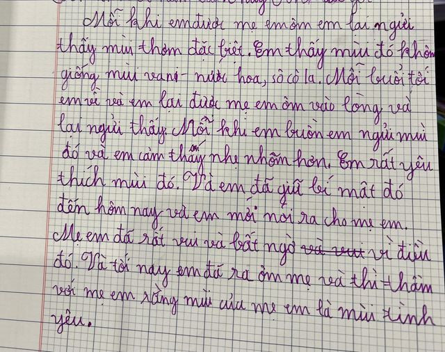 “Mỗi khi được mẹ ôm, em lại ngửi thấy mùi thơm đặc biệt. Em thấy mùi đó không giống mùi vani, socola hay mùi nước hoa. Mỗi buổi tối em về lại được mẹ ôm vào lòng và lại ngửi thấy. Mỗi khi buồn em lại ngửi thấy mùi đó và cảm thấy nhẹ nhõm hơn. Em rất yêu thích mùi đó. Em đã giữ bí mật đó đến hôm nay mới nói ra cho mẹ. Mẹ em rất vui và bất ngờ vì điều đó. Tối nay em ra ôm mẹ và thì thầm với mẹ em rằng mùi của mẹ là mùi tình yêu”.