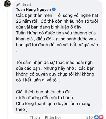 Bên cạnh đó Tuấn Hưng cho rằng khó có thể giải thích sao cho đủ: "Các bạn thân mến, tôi sống với nghề hát 25 năm rồi. Có thể còn nhiều hớn số tuổi của vài bạn đang bình luận ở đây. Tuấn Hưng có được tình yêu thương của khán giả, điểu đó không gì so sánh được và không bao giờ tôi đánh đổi nó với bất cứ giá nào. Tôi cảm nhận được sự thắc mắc hoài nghi của các bạn. Nhưng hãy nhớ các bạn không có quyền quy chụp tôi khi không có một kết luận gì về tôi".