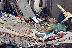 Tại hiện trường, vách tường bị đổ sập, mảng mái nhà vệ sinh cùng khung thép phía trên bị vỡ. Cạnh thi thể nạn nhân có các bình khí nén.
