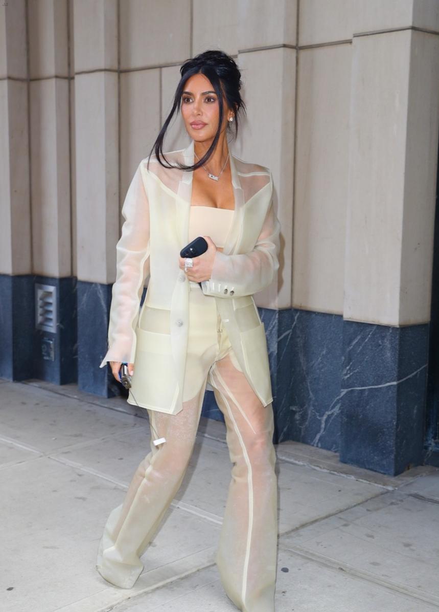 Nổi tiếng với phong cách thời trang gợi cảm, quyến rũ, Kim Kardashian tham dự Hội nghị thượng đỉnh Time100 tại New York, Mỹ với một set suit màu trắng trong suốt. Thiết kế của thương hiệu Rick Owens được làm bằng vải tuyn (tulle), để lộ phần lớn da thịt của người mặc.