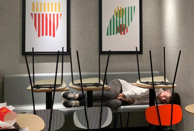 4h sáng, blogger mệt mỏi trở về "phòng khách sạn" là cửa hàng thức ăn nhanh mà anh đã nhắm trước. Khung cảnh tại đây "đông đến ngạc nhiên". Có người đang ngủ, những người khác la hét và "dường như có đến năm thứ tiếng xung quanh tôi", anh kể lại. Sau một ngày đi bộ và "buồn ngủ đến chết ngay được", anh đeo kính râm, cùng bạn thay phiên ngủ.