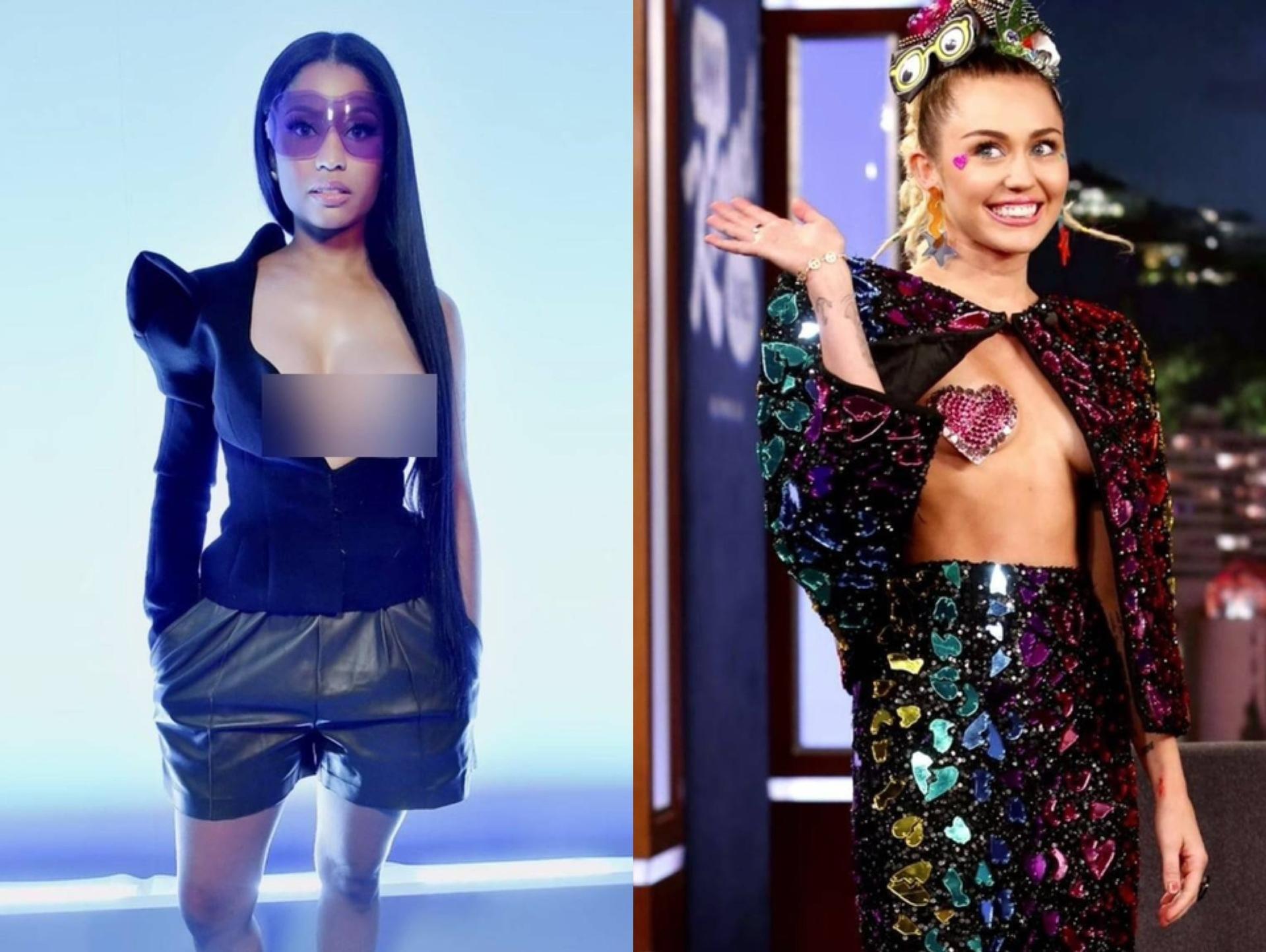 Thay vì mặc đồ xuyên thấu kết hợp miếng dán ngực, Nicki Minaj (trái) diện thiết kế phô cả bầu ngực ra ngoài. Ảnh: Pop Sugar.