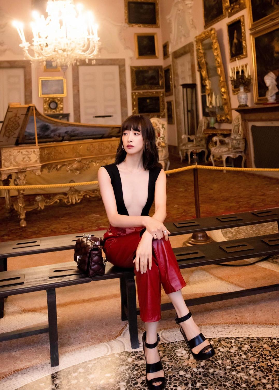 Sohu đưa tin Tống Thiến mặc trang phục gợi cảm khi dự show thời trang của Louis Vuitton ở Italy. Nữ diễn viên diện thiết kế không tay màu đen, có chi tiết xẻ sâu giữa ngực. Cô phối mẫu áo quyến rũ cùng quần đỏ và túi xách từ nhà mốt Pháp. Trang phục hở bạo khiến Tống Thiến vướng phải loạt bình luận chỉ trích. Ảnh: Weibo.