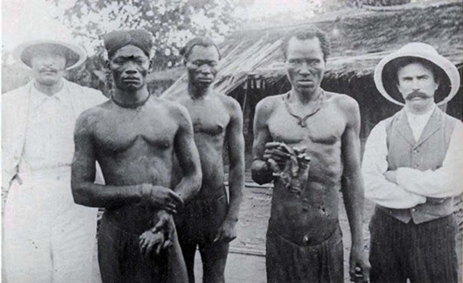 Lính đánh thuê đang cầm bàn tay bị chặt lìa của nô lệ tại Bolenge và Lingomo, Congo năm 1904.