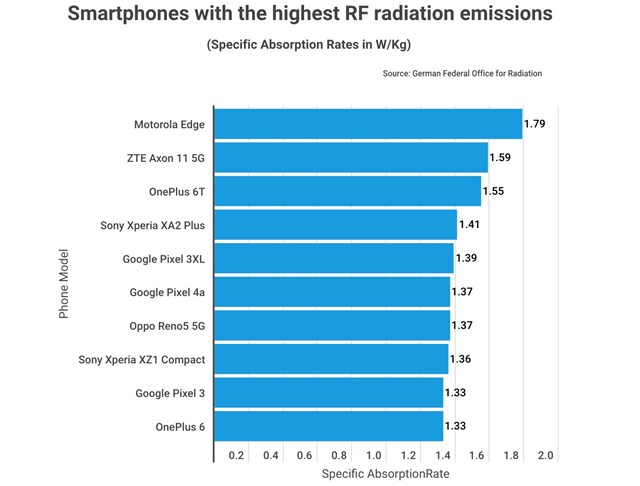 Năm kiểu máy sau đây phát ra một số bức xạ mạnh nhất trên thị trường: Motorola Edge (1,79 w/kg); OnePlus 6T (1,55 w/kg); Sony Xperia XA2 Plus (1,41 w/kg); Google Pixel 3 XL (1,39 w/kg); và Google Pixel 4a (1,37 w/kg) bằng với Oppo Reno5 5G (1,37 w/kg).