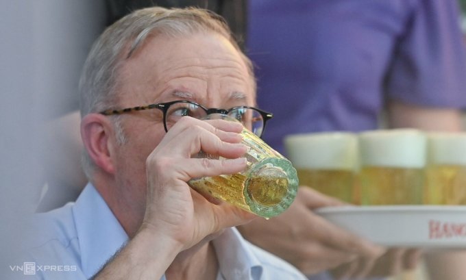 Thủ tướng Albanese uống bia hơi tại Hà Nội trưa 3/6. Ảnh: Giang Huy