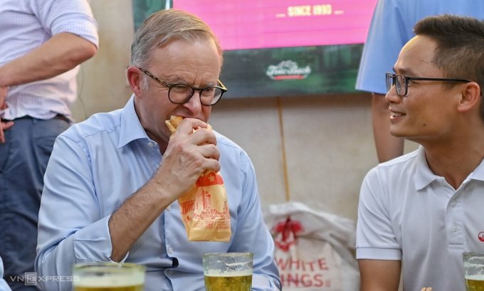 Thủ tướng Albanese ăn bánh mì và uống bia hơi tại Hà Nội, nhấn mạnh chúng được làm từ lúa mì và đại mạch Australia.