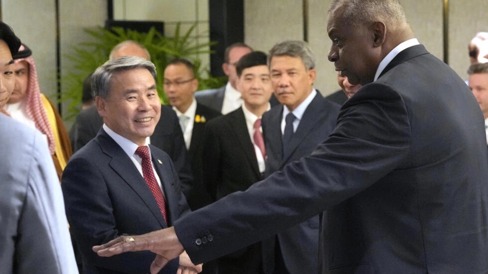Bộ trưởng Quốc Phòng Hàn Quốc Lee Jong-sup và đồng nhiệm Hoa Kỳ Lloyd Austin bên lề Đối thoại Shangri-La, Singapore, 03/06/2023. AP - Vincent Thian