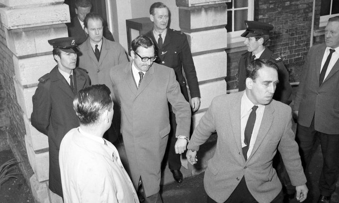 Bruce Reynolds (đeo kính), chủ mưu vụ cướp, rời tòa án ở Bedfordshire, Anh hồi tháng 11/1968.