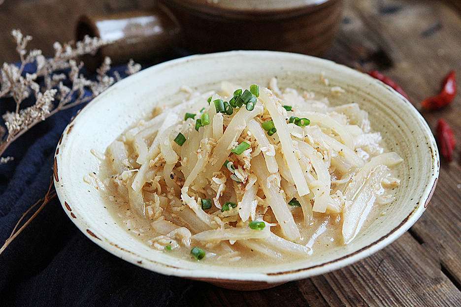 Bước 2: Củ cải trắng gọt vỏ, thái thành sợi nhỏ. Cho nóng chảo, không thêm dầu vào mà cho củ cải vào xào sơ để chúng thoát hơi nước. Để qua một bên.
