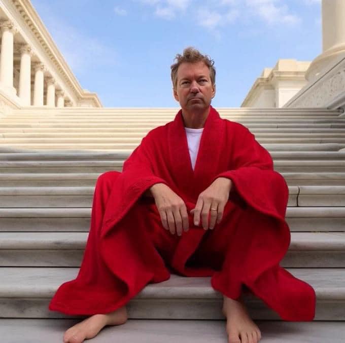 -Trong một hành động chống đối việc thượng viện cho ăn mặc xì lỏn áo thun đi họp. Thượng nghị sĩ Rand Paul cộng hoà đã đến làm việc ở thượng viện hôm nay bằng chân trần và mặc áo choàng tắm đỏ.