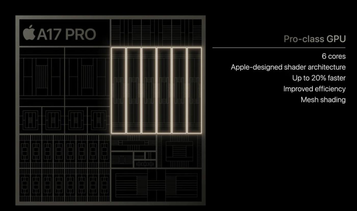Không những thế, cùng với các cải tiến khác, chipset A17 Pro là lần "thiết kế lại lớn nhất trong lịch sử GPU của Apple", giúp gia tăng 20% hiệu năng tổng thể. Theo tuyên bố của Apple, GPU của A17 Pro được thiết kế với 6 nhân đồ họa, mang lại hiệu năng tối đa cao hơn đồng thời cải thiện hiệu quả sử dụng năng lượng của bộ xử lý.