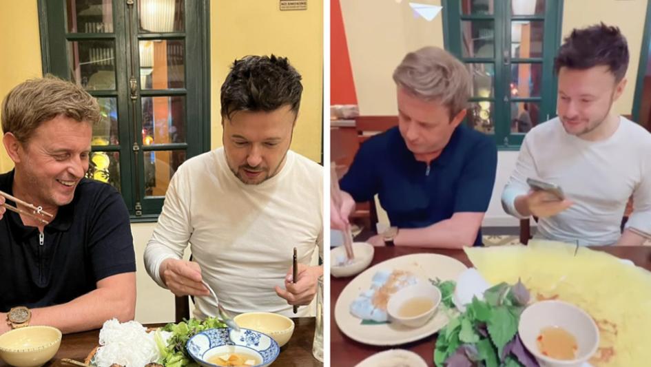 Trở lại Việt Nam lần thứ 4, ban nhạc huyền thoại 911 không giấu nổi sự thích thú khi được thưởng thức nhiều món ngon ở Thủ đô như bún chả, bánh cuốn, bánh xèo, kem Tràng Tiền.