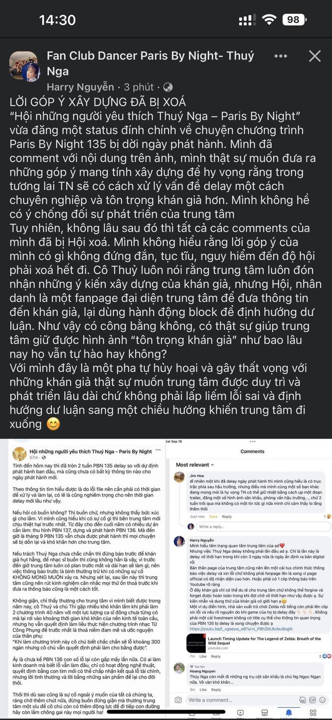 Thứ 3, vì đây là fanclub nên cũng có luật của fanclub, nếu các bạn fans không cùng chí hướng thì sẽ bị block thôi. Quyền tự do ngôn luận là có, nhưng đừng có lấy cái quyền đó mà tự cho mình cái quyền muốn nói gì thì nói, tới khi bị block thì giãy nãy lên. Em nói em không nói gì quá đáng, vậy thì cái kiểu nói chuyện "sự kiên nhẫn và dung thứ của khán giả có giới hạn" là có hỗn không em? Thúy Nga làm gì có lỗi với em mà em dùng từ "dung thứ". Em nói MC N.H phát biểu kêu khán giả thông cảm chờ thêm vài ngày là "hãm" thì em kêu tụi anh không block em kiểu gì hả em? Khi nào Thúy Nga lấy tiền của khán giả trước rồi im lặng không nói gì lại delay phát hành show thì em có quyền chửi, đằng này chỉ là một sự cố ngoài ý muốn nên phải ngưng hết mọi plan phát hành lẫn quảng bá. Trong bài post vừa rồi, tụi anh cũng có để lại 1 câu góp ý là Thúy Nga nên rút kinh nghiệm cho những lần quảng bá sau. Em còn muốn gì hơn nữa? Em muốn là page phải hùa theo em khịa Paris By Night nên đổi thành DELAY BY NIGHT thì em mới chịu hay sao?