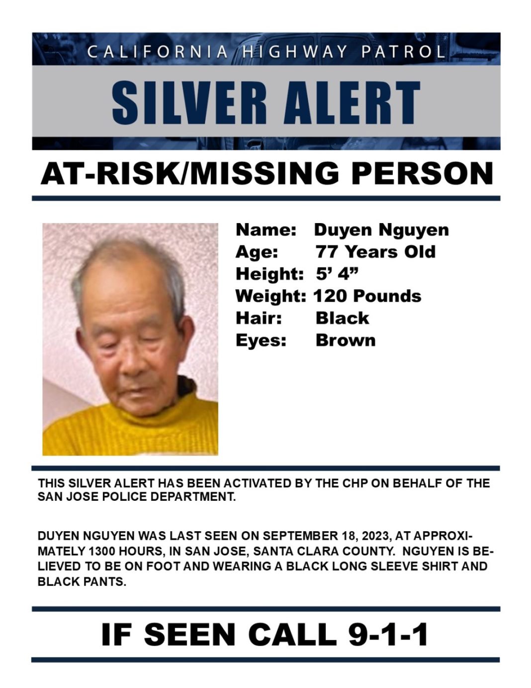 Cảnh sát Tuần cảnh Xa Lộ California – CHP – ban hành Báo động liên quan đến trường hợp một người cao niên gốc Việt ở San Jose được trình báo mất tích.