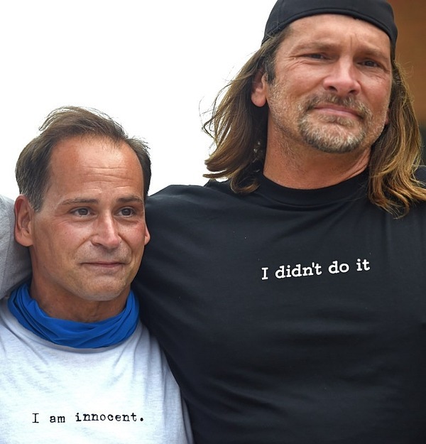 Ricky Birch (trái) và Shawn Henning (phải) chụp ảnh trước tòa án tối cao Connecticut ở Torrington hồi tháng 10/2020, mặc áo với dòng chữ "Tôi vô tội" và "Tôi không phải là thủ phạm". Ảnh: Hartford