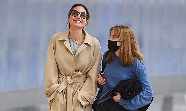 Angelina Jolie mặc chiếc áo khoác dài khi xuống sân bay JFK. Vivienne, con gái cô, 15 tuổi, mặc bộ quần áo dài tay thoải mái. Hai mẹ con vừa đi bộ qua phi trường vừa trò chuyện và cười vui vẻ.