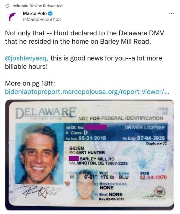 Người nhận tiền là Robert Hunter Biden với địa chỉ "1209 Barley Mill Rd." ở Wilmington, Delaware. Đây là địa chỉ nơi ở chính của ông Joe Biden.