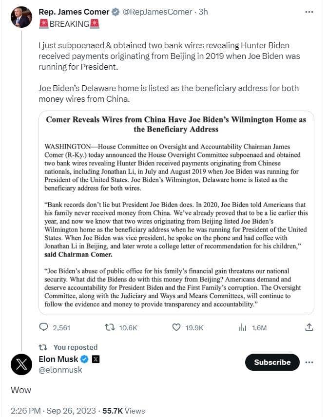 Ủy ban có hồ sơ được cho là tiết lộ rằng từ năm 2014 đến năm 2019, gia đình Biden và các cộng sự đã nhận được $24 triệu từ nước ngoài – $15 triệu cho gia đình Biden và $9 triệu cho các đối tác kinh doanh của họ, nhiều hơn $4 triệu so với trước đây được biết đến.