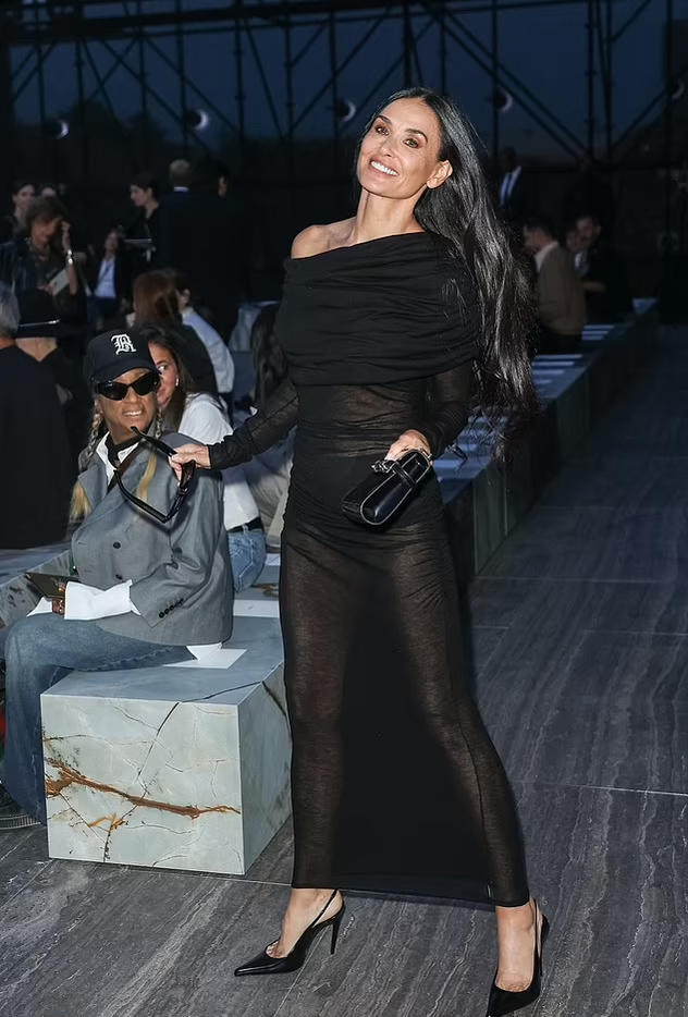 Demi Moore diện đầm mỏng tang tham dự show Saint Laurent Womenswear Xuân hè 2024. Thiết kế có lớp vải che phủ vòng một, tuy nhiên trong một số khoảnh khắc minh tinh hất tóc, lớp vải bị vén lên quá cao.