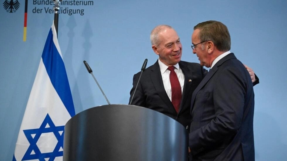 Bộ trưởng Quốc Phòng Đức Boris Pistorius (T) và đồng nhiệm Israel Yoav Gallant ngày 28/09/2023 tại Berlin, Đức, trong cuộc họp báo sau khi ký thỏa thuận mua bán lá chắn tên lửa Arrow-3. AFP - TOBIAS SCHWARZ
