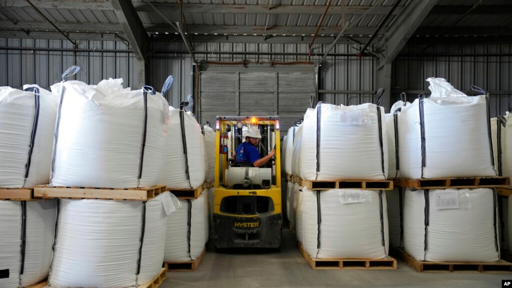 Một công nhân chuyển các bao hoá chất lithium carbonate tại một cơ sở của công ty sản xuất hóa chất Mỹ Albemarle Corporation, ngày 6/10/2022, tại Silver Peak, Nevada.