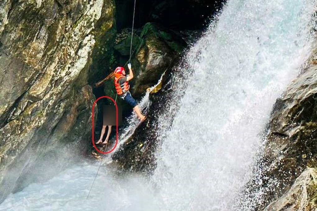 Du khách quốc tịch Nga không may bị mắc kẹt ở hốc đá giữa thác nước chảy xiết ở Đà Nẵng. Lực lượng cứu hộ đã đu dây qua thác nước, tiếp cận giải cứu người bị nạn.