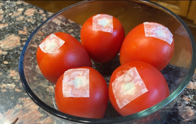 Có một phương pháp hiệu quả hơn là lấy băng dính dán vào cuống. Cuống là điểm yếu nhất trên quả cà chua nên khi dán kín, chúng ta đang tạo ra một rào cản, ngăn cản các vi khuẩn xâm nhập, cũng như giữ lại độ ẩm cần thiết cho cà chua.