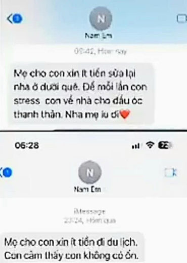 Dân mạng vừa chia sẻ một loạt ảnh tin nhắn được cho là của Nam Em với người được xem là "mẹ nuôi" của cô. Dựa trên những đoạn tin nhắn này, có thể thấy nàng hậu đã nhiều lần xin tiền để đi du lịch, xả stress, mua tai nghe và nhận được hàng trăm triệu đồng.