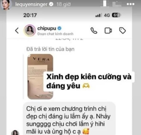 Đoạn tin nhắn cũng như tinh thần cổ vũ, ủng hộ Lệ Quyên khiến nữ ca sĩ không khỏi xúc động. Cô đã miêu tả đàn em Chi Pu là một cô gái "xinh đẹp, kiên cường và đáng yêu".