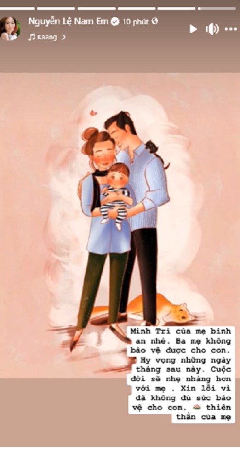 "Minh Trí của mẹ bình an nhé. Ba mẹ không bảo vệ được con. Hy vọng những ngày tháng sau này cuộc đời sẽ nhẹ nhàng hơn với mẹ. Xin lỗi vì đã không đủ sức bảo vệ con, thiên thần của mẹ" - Nam Em viết. Vì Nam Em không chia sẻ cụ thể vấn đề nên dân tình vẫn chưa hiểu chuyện gì đang xảy ra.