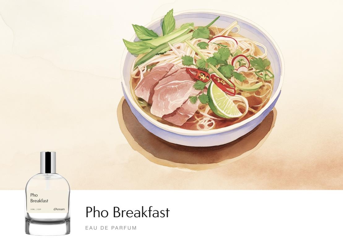 Doanh nhân nhận định d'Annam là thương hiệu Việt đầu tiên đưa vị phở vào nước hoa. Pho Breakfast đưa người dùng qua nhiều tầng hương, bắt đầu với nốt húng quế tươi, gừng nướng, hoa hồi. Mùi ngò rí, bạch đậu khấu, vỏ quýt lan tỏa ở tầng giữa. Sau khi lưu trên da 1-2 tiếng, hương thơm sẽ lắng xuống, trầm hơn nhờ hoắc hương, gỗ tuyết tùng.