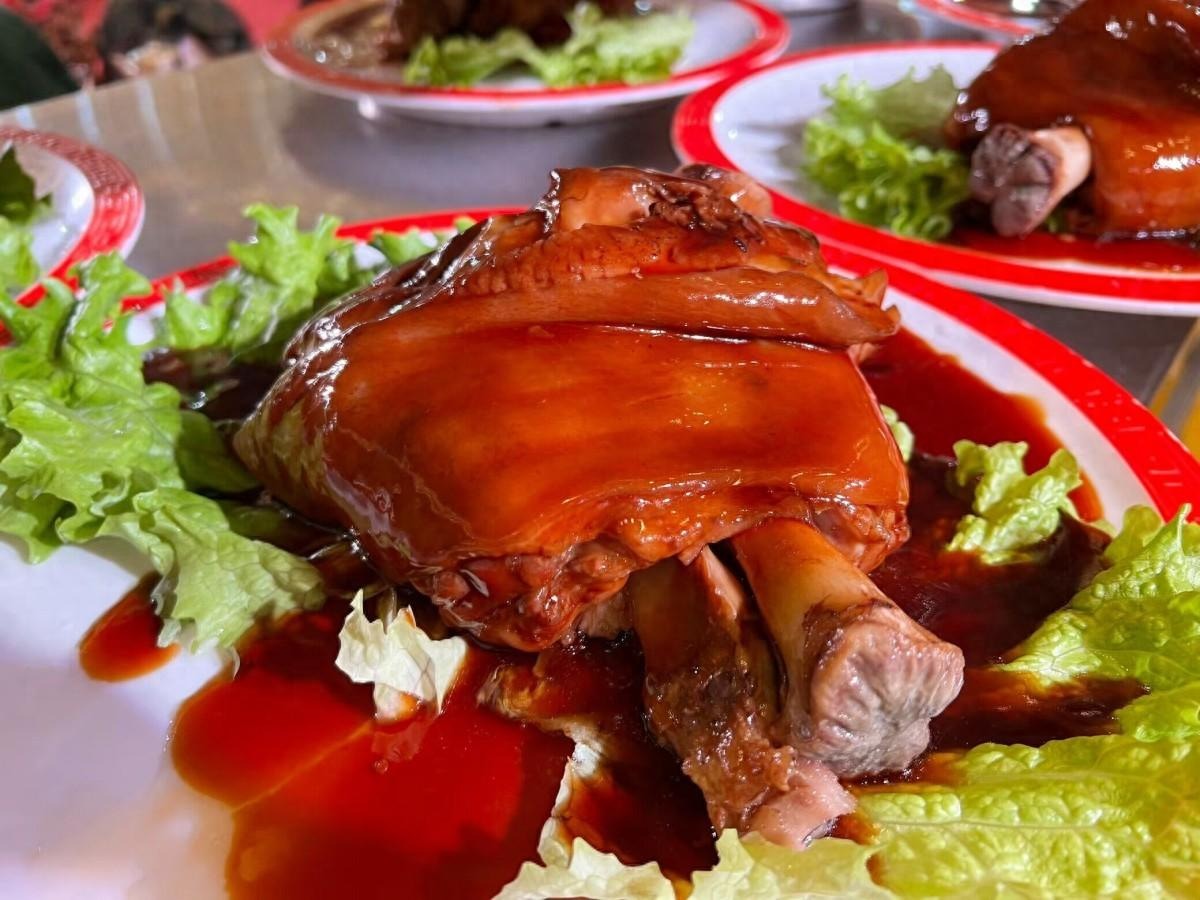Cho một lượng thích hợp nước tương nhạt, nước tương đen, rượu nấu ăn, đường phèn vào khuấy đều rồi cho nước vừa đủ, đun sôi trên lửa lớn rồi giảm lửa nhỏ đun cho đến khi thịt chân giò mềm mại.