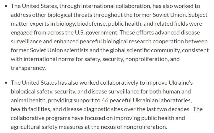Hoa Kỳ cũng đă hợp tác làm việc để cải thiện an toàn sinh học, an ninh và giám sát dịch bệnh của Ukraine đối với cả sức khỏe con người và động vật, hỗ trợ cho 46 pḥng thí nghiệm, cơ sở y tế và cơ sở chẩn đoán bệnh tật của Ukraine trong hai thập kỷ qua. Các chương tŕnh hợp tác đă tập trung vào việc cải thiện sức khỏe cộng đồng và các biện pháp an toàn nông nghiệp liên quan đến việc không phổ biến vũ khí hạt nhân.