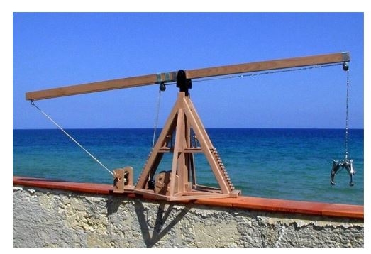 Để bảo vệ biên phòng của Syracuse khỏi các cuộc tấn công đổ bộ, vũ khí đỉnh cao đã được thiết lập, các nhà sử học cổ đại nhận định cỗ máy này được mô tả như một loại cần trục được trang bị móc neo nhỏ.