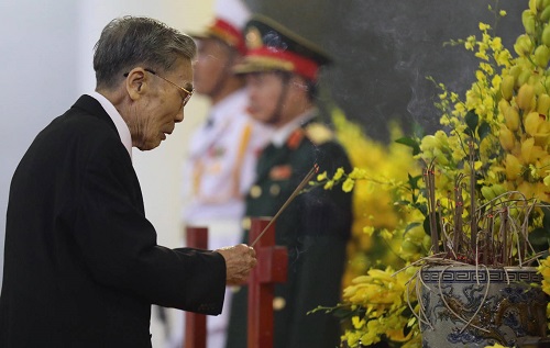̣93 tuổi, cựu tù chính trị nhà tù Hỏa Ḷ Tạ Quốc Bảo (Tạ Sinh Nhạ) run run thắp nén nhang trước linh cữu nguyên Tổng bí thư. Sinh ra trong gia đ́nh nhà nho yêu nước ở xă Đông Hội (Đông Anh, Hà Nội), ông Bảo sớm giác ngộ cách mạng, trở thành liên lạc của Xứ ủy Bắc Kỳ năm 1941-1942.