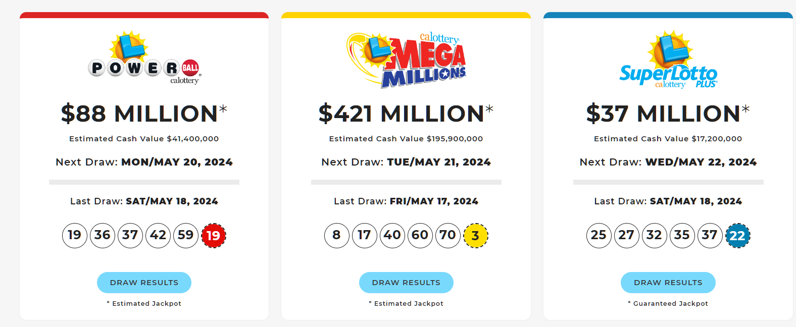 Kỳ quay số Powerball vào thứ Bảy (18 tháng 5) đã mang đến cho California một triệu phú mới. Theo KTLA, chiếc vé trúng thưởng, trùng với 5 số trong kỳ quay số, được bán tại tiệm Q Quick Mart ở Magnolia Avenue ở Anaheim. Chiếc vé trúng thưởng trị giá 3.18 triệu mỹ kim, nhưng hiện tại người chiến thắng vẫn chưa nhận thưởng. Các con số trong kỳ quay số là 19, 36, 37, 42 và 59 và Powerball là 19. Không có vé nào ở Hoa Kỳ khớp với tất cả sáu con số nên giải độc đắc Powerball tăng lên mức ước tính 88 triệu mỹ kim cho kỳ quay hôm thứ Hai. Cho đến nay trong năm 2024 vẫn chưa có người trúng giải độc đắc ở California. Tuy nhiên, vào năm 2023, hai tấm vé trúng thưởng trị giá hàng tỷ mỹ kim đã được bán, một chiếc tại Las Palmitas Mini Market ở trung tâm thành phố Los Angeles và chiếc còn lại tại Midway Market ở Frazier Park.
