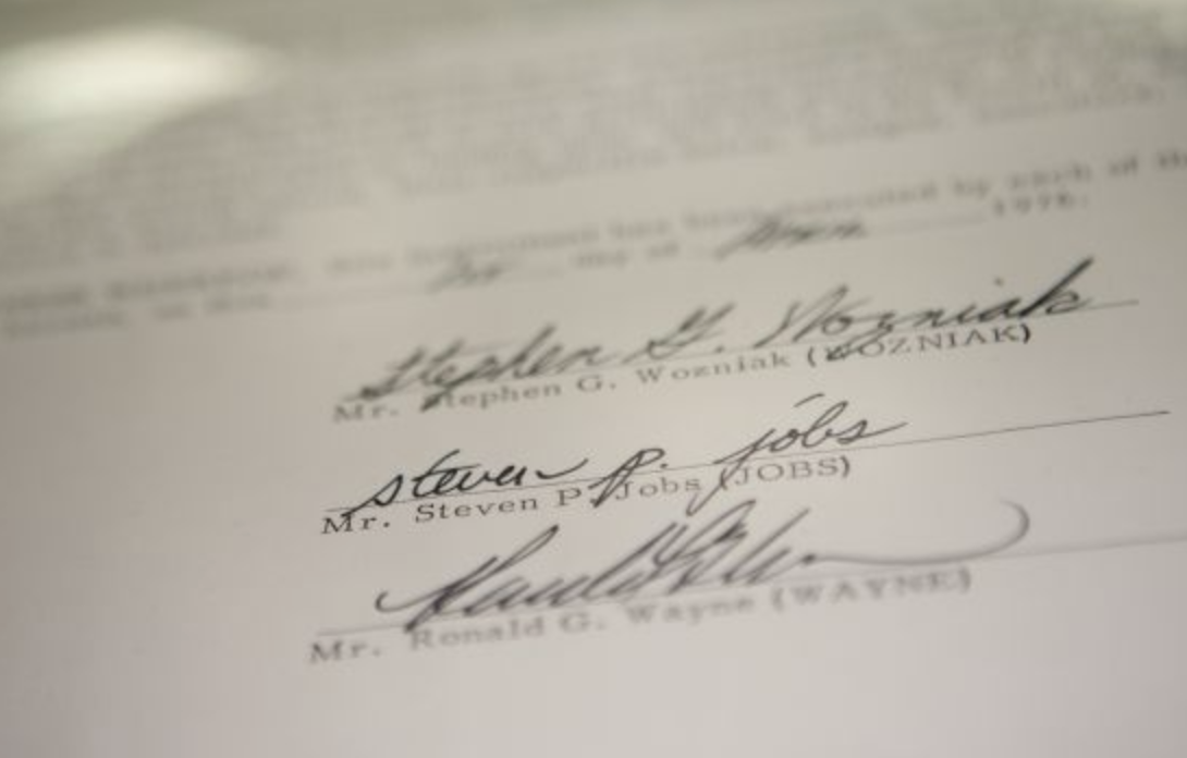 Thỏa thuận lập doanh nghiệp với chữ ký của ba người: Ông Steve Wozniak, Steve Jobs và Ronald Wayne Ảnh: Bloomberg