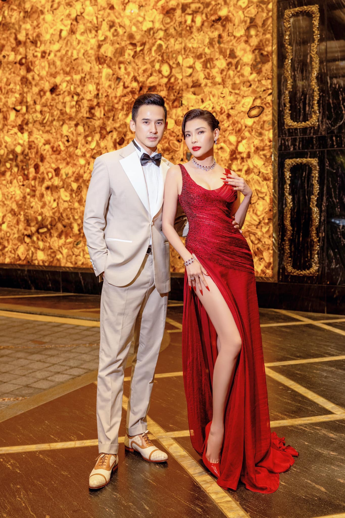Nữ diễn viên Thúy Diễm và chồng nhanh chóng thu hút sự chú ý khi xuất hiện trong show "Giai nhân" của NTK Đỗ Long. Cô lựa chọn đầm dạ hội màu đỏ rực, xẻ cổ chữ V khoe khéo vòng 1 đầy đặn.