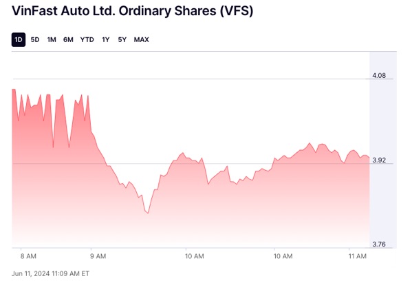 Cổ phiếu Vinfast đă tăng 100% kể từ lúc mất giá kỷ lục c̣n 2 USD/ share. Ngày 11/6/2024 cổ phiếu Vinfast đă tăng tới 4 USD nhờ lởi thế kinh doanh xe taxi tại VN.