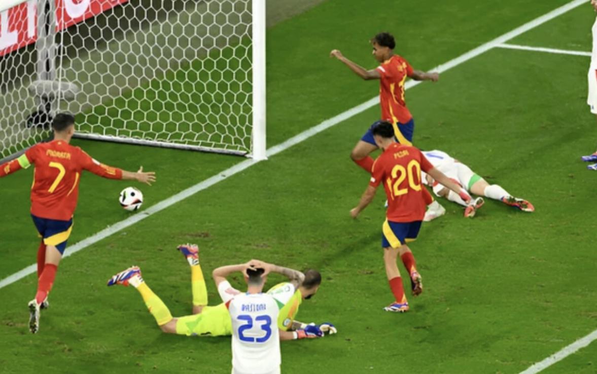 Phút 55 của trận đấu, Nico Williams có pha xộc thẳng xuống biên trái trước khi tung ra đường căng ngang đẹp mắt vào trong. Đội trưởng Tây Ban Nha - Alvaro Morata bật cao đánh đầu khẽ chạm bóng khiến thủ thành Donnarumma giật mình với tay chạm bóng, vừa hay đưa bóng đến chân Calafiori đang lao về, bật thẳng vào lưới mở tỷ số trận đấu.