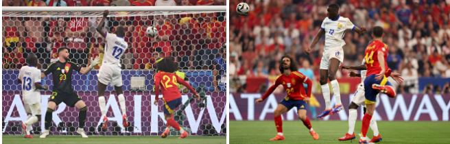 Tây Ban Nha đẩy cao đội hình ngay sau tiếng còi khai cuộc và sớm khiến hàng thủ Pháp chao đảo. Ngay phút thứ 6, Lamine Yamal treo bóng chuẩn xác đến vị trí của Fabian Ruiz. Tuy nhiên, cú đánh đầu của tiền vệ đang khoác áo PSG lại đi vọt xà.