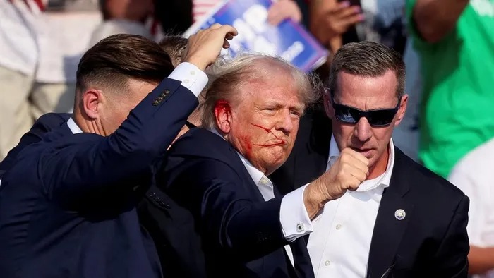 Các nhân viên mật vụ đưa ông Trump rời khỏi sân khấu sau vụ nổ súng tại sự kiện vận động tranh cử ở Butler, Pennsylvania, ngày 13/7/2024. Ảnh: Reuters